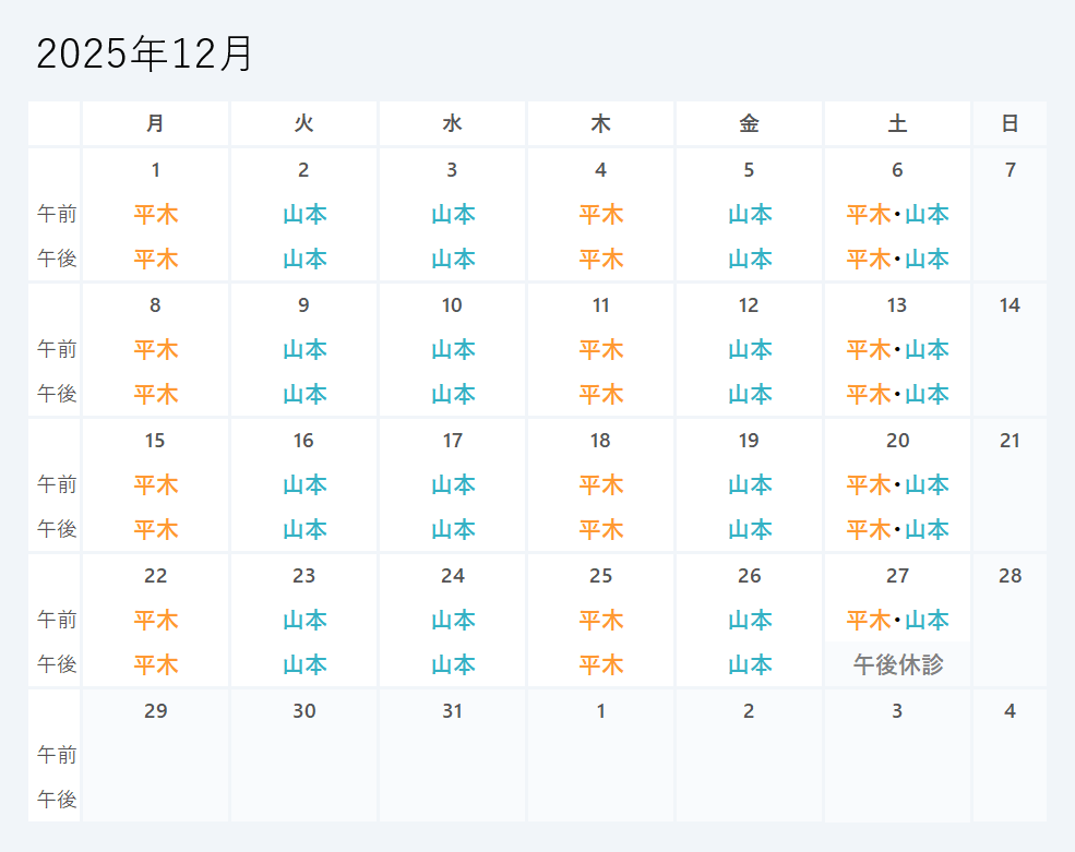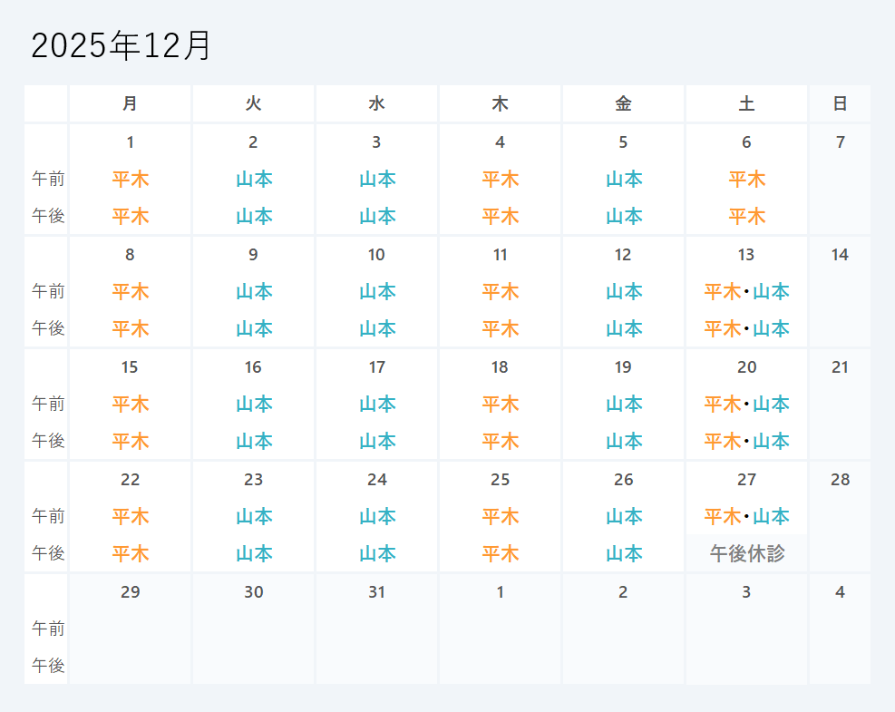 繁忙日など都合により、担当外の医師が応援に入ることがございますが、ご了承ください。なお、医師の指定がある場合は、ご遠慮なくおっしゃってください。