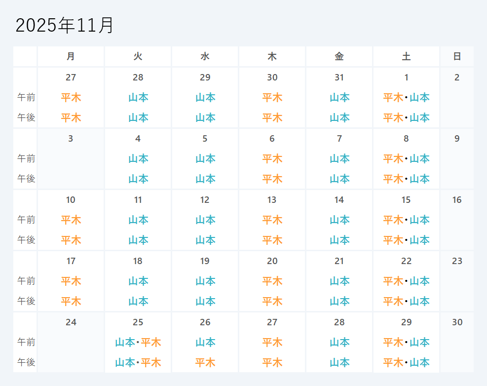 | 午前 | ● | ● | ● | ● | ● | □ | - | - |