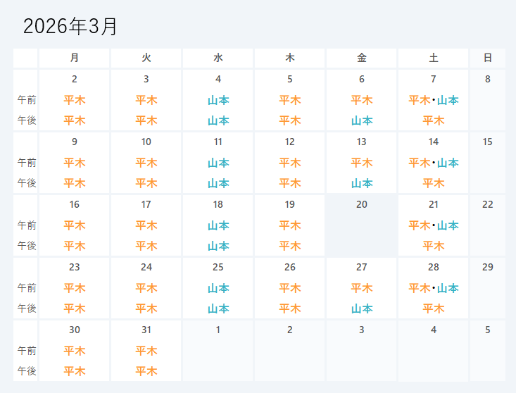 繁忙日など都合により、担当外の医師が応援に入ることがございますが、ご了承ください。なお、医師の指定がある場合は、ご遠慮なくおっしゃってください。